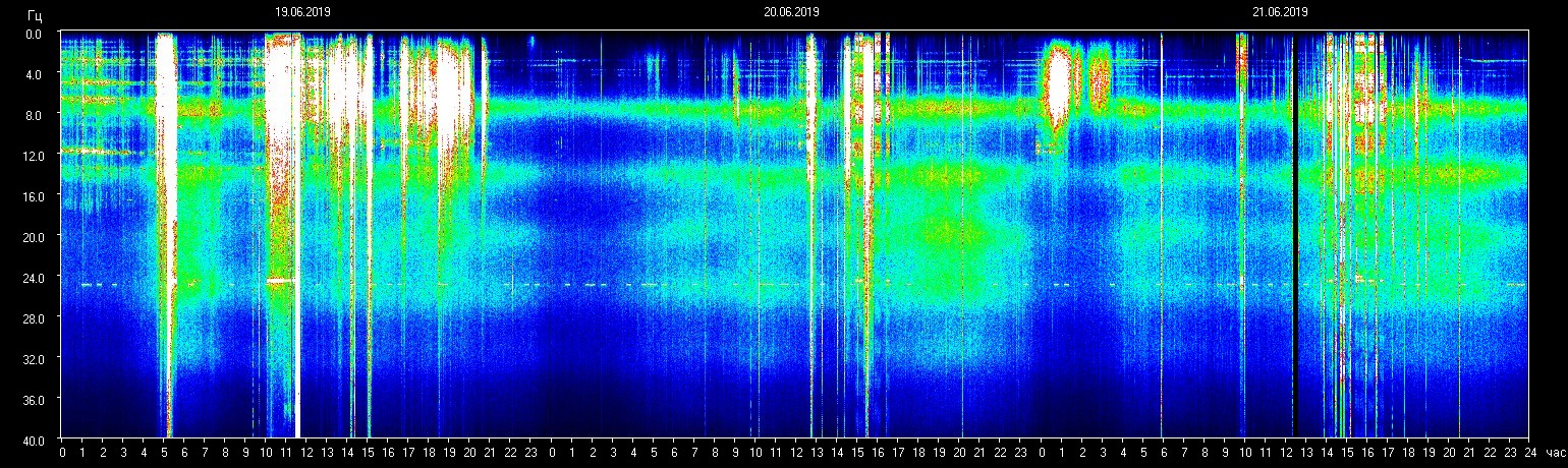 Jag har sett liknande tidigare där mycket kraftiga breda vita utslag på frekvensen kommit på regelbundna klockslag och vi kan faktiskt även ovan se vita smalare toppar runt 11-12 tiden idag, den 20:e och den 19:e (kl. 15 rysk tid).