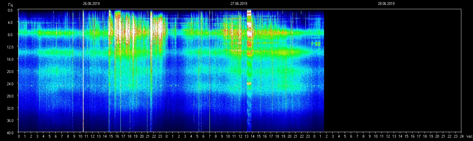 Ingen större förändring mot föregående tredagarsperiod, möjligen marginellt ökat brus där de horisontala lugnare blå banden mellan de olika frekvensbanden 7,83Hz över 14,3Hz, 20,8Hz och 27,3Hz har suddats ut lite mer. Det innebär att vi har bred påverkan på Schumann frekvensen. Vi ser även att genomslag av lite kraftigare vita utslag som smala ränder som täcker hela perioden med endast en något lugnare tretimmarsperiod för ca 24 timmar sedan.