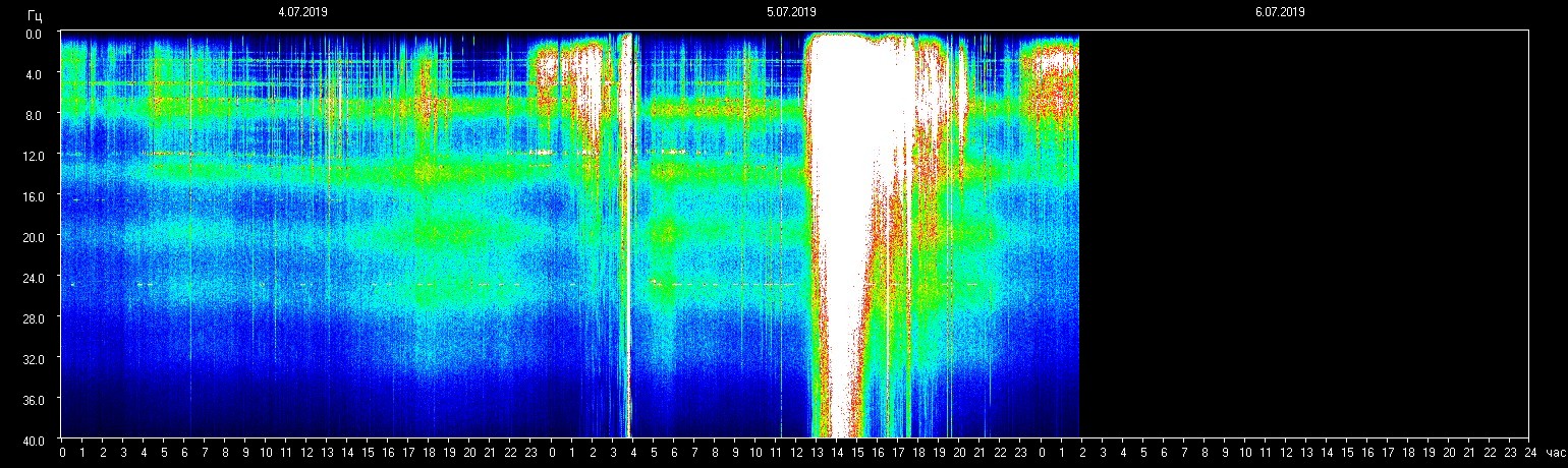 Det kraftiga utslaget på Schumannresonansen den 2/7 varade ca 5 timmar och sedan gick vi tillbaks till den höga grundnivå som vi tidigare sett. Det har alltså fortsatt varit mer eller mindre konstanta utslag på de olika frekvensbanden. Igår vid 20-tiden (mitten på grafen) såg vi på nytt ett kraftigare utslag i de lägre frekvensbanden och idag har vi haft ett ännu kraftigare utslag mellan kl. 8-15 (breda vita fältet) som därefter lugnade sig för att just nu ger ett kraftigare utslag på nytt, i de lägre frekvensbanden.