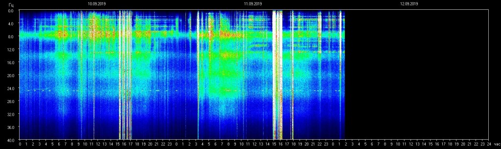 Klockan 11-12 idag den 11 september liksom igår vi ungefär samma tid ser vi en timmes intensivare resonans i frekvenserna. I övrigt ser vi tydligare utslag på alla de lägre basfrekvenserna och smala tätare utslag över hela frekvensbandet hela perioden. Det vi ser liknar det vi tittat på tidigare. För några dagar sedan när jag gjorde en hastig titt var det lugnare än det vi ser här.