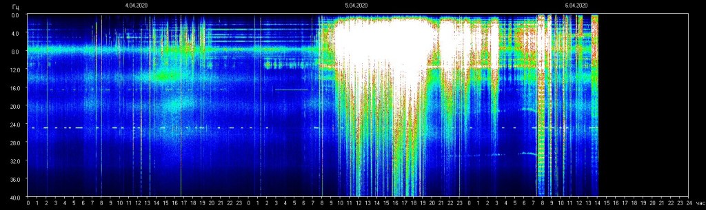 Så, vi kan se hur resonansen börjar öka från ca 9.00 fram till lokal tid 11.45 där vi ser en peak lodrätt över hela spektrat och sedan fortsätter det starkt i timmar efteråt. Jämför vi mot lugnet under dygnet den 4/4 är det uppenbart hur aktiviteten snyggt sammanfaller med ökad koordinerad medvetenhet.
